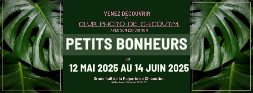Le Club photo de Chicoutimi a le plaisir de vous inviter a son exposition collective « Petits bonheurs », qui se tiendra du lundi 12 mai jusqu’au samedi 14 Juin 2025.