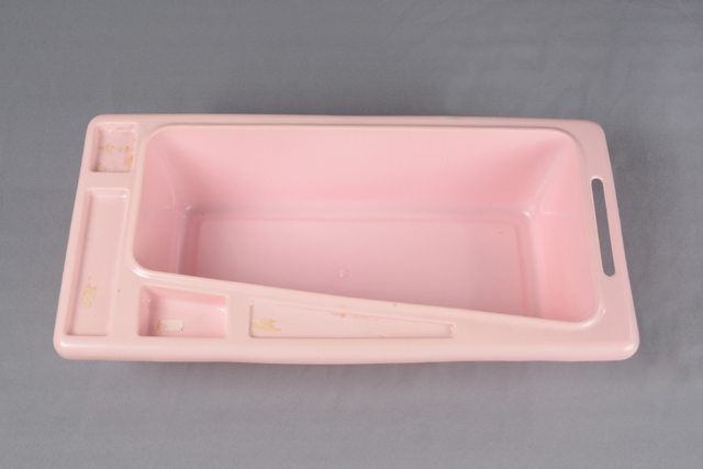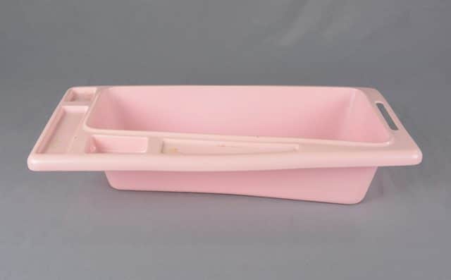 Baignoire miniature en plastique rose. Sur les côtés de la baignoire, il y a quatre casiers dans lesquels se trouvent des traces d’étiquettes autocollantes.