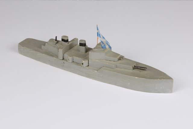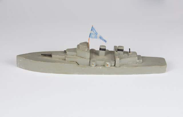 Bateau miniature de type contre-torpilleur peint en gris avec les canons en noir ainsi qu’une ligne noire sur chaque cheminée. Le bateau porte un petit drapeau du Québec bleu et blanc monté sur un mât de bois peint en orange.