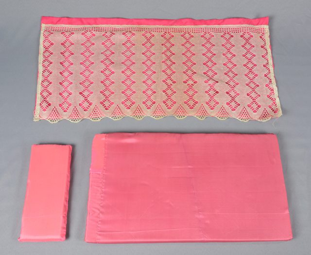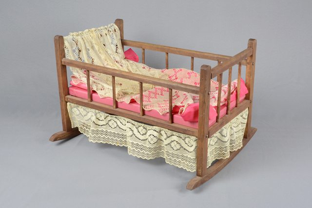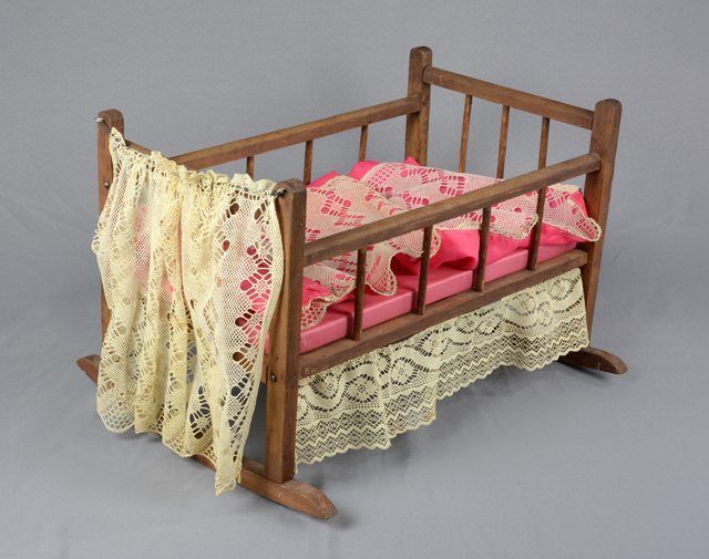 Berceau de poupée à barreaux en bois avec un matelas et un oreiller recouverts d’un tissu satiné rose et une couverture rose décorée de dentelle. De la dentelle est également suspendue sur les côtés et au pied du berceau. Sur le barreau supérieur à la tête du berceau se trouve un drap de dentelle suspendu à un fil de fer et recouvrant l’oreiller.