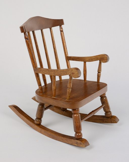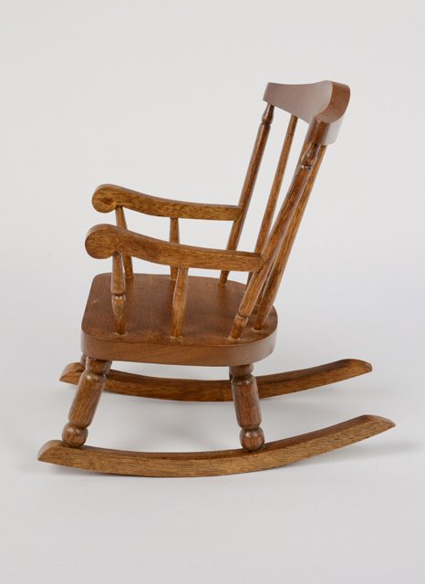 Chaise berçante de poupée, en bois verni.