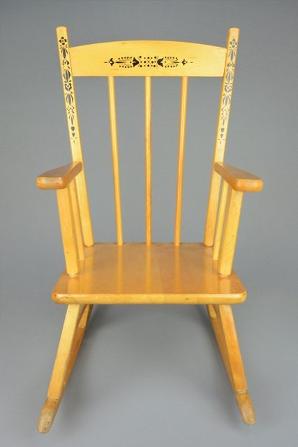 Petite berceuse de bois clair, ornée de motifs floraux peints en noir sur le haut du dossier.