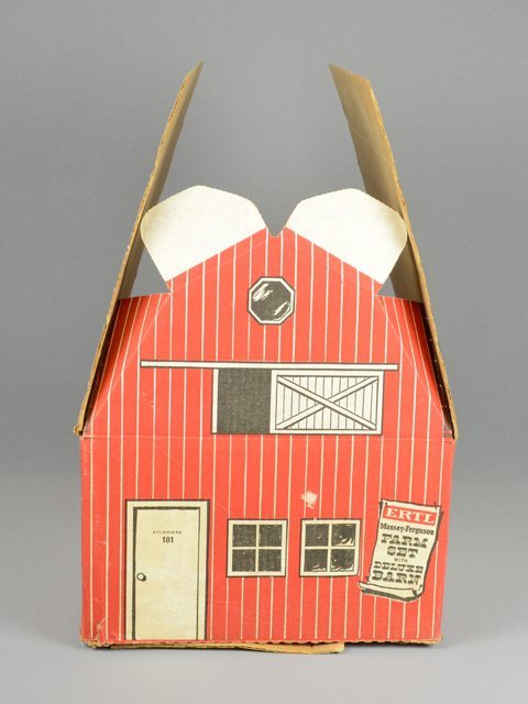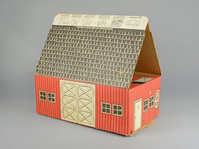 Boîte d’emballage d’un tracteur jouet pouvant se transformer en grange. Des illustrations de portes blanches, de fenêtres, de portes de grange et de bardeaux sont imprimées sur le carton en noir et rouge sur du blanc.