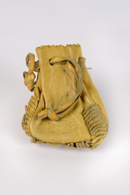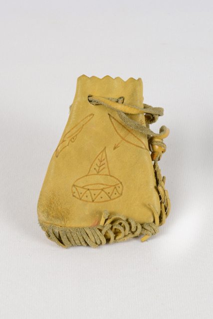 Bourse en cuir naturel avec des gravures de dessins d’arc, de tipi et de fusil. La bourse possède des franges au bas et une bandoulière passant par des trous sur le bord ouvrant.