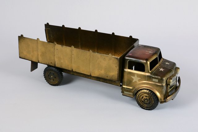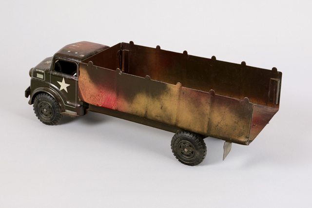Camion jouet militaire en métal avec six roues en plastique. Il est de couleur kaki avec des ajouts de peinture bronze et rouge qui ne semblent pas d’origine (?). Sur les portières et sur le capot se trouvent des étoiles blanches. Les phares, les trous de radiateur, les étoiles et la marque du camion sont des ajouts à la peinture noire et blanche.