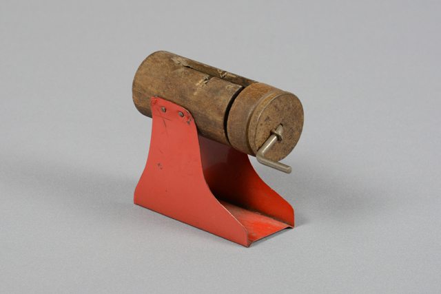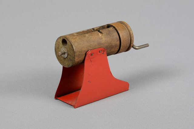 Canon jouet miniature dont la base en métal est peinte en rouge. Le canon est en bois sans coloration et il est muni d’une petite manivelle.