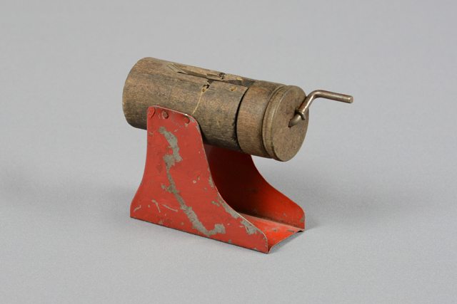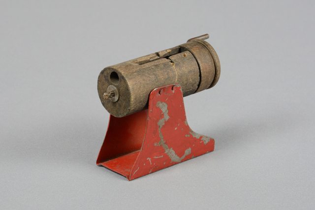 Canon jouet modèle réduit dont la base en métal est peinte en rouge. Le canon est en bois sans coloration et il est muni d’une petite manivelle.