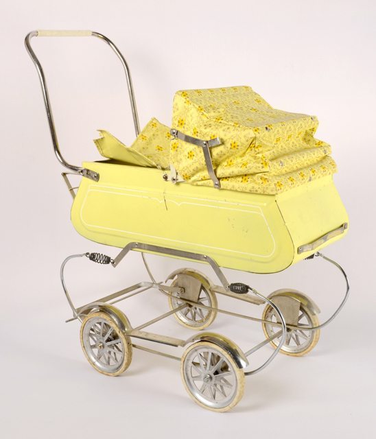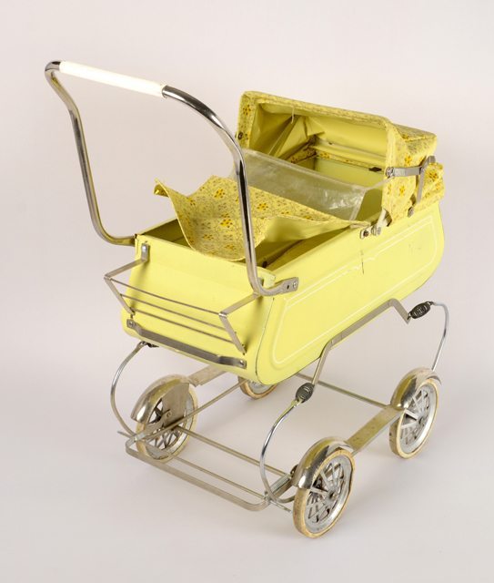 Carrosse en métal jaune à suspension à ressort muni d’un capot pare-soleil en toile plastifiée à motif floral. Dans le fond du carrosse se trouve un matelas jaune en plastique rembourré.