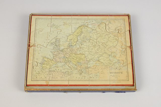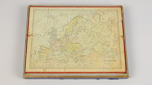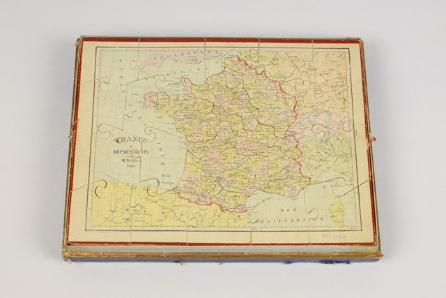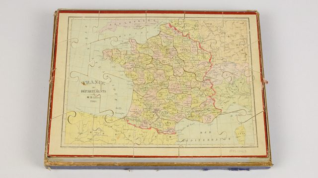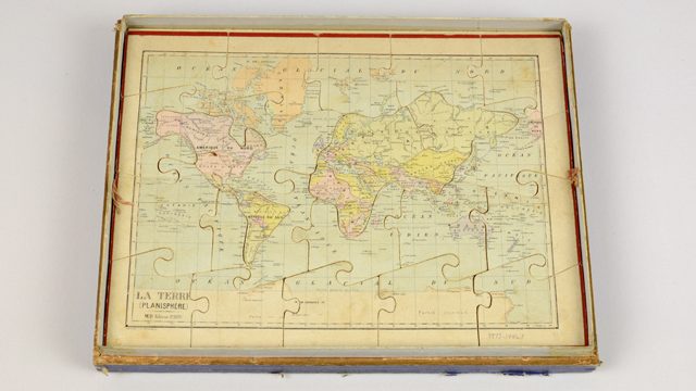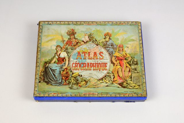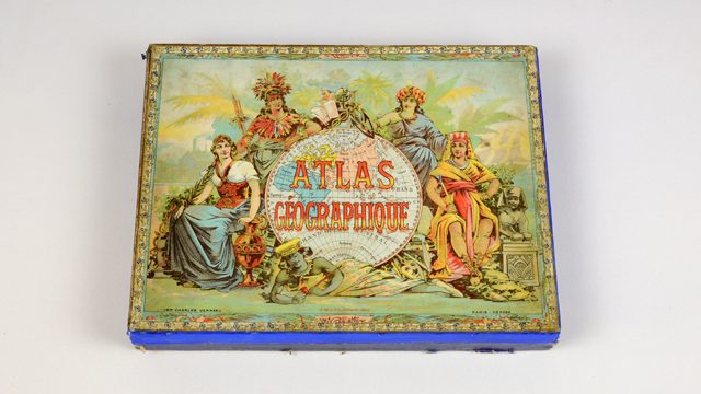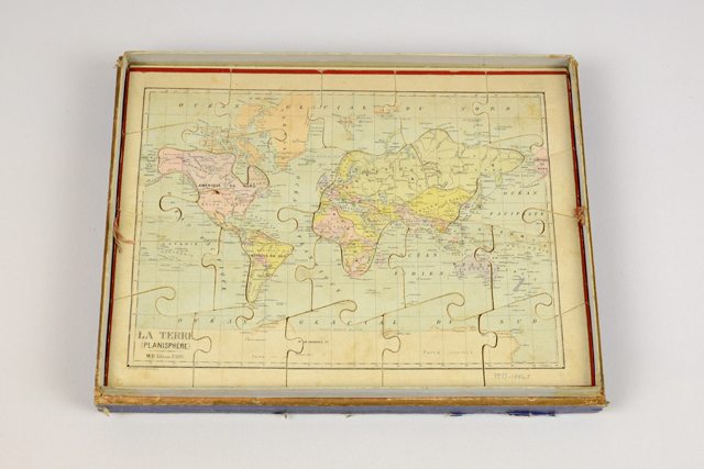 Casse-tête éducatif sous forme d’atlas géographique. Il comprend une boîte bleue avec son couvercle sur lequel se trouvent un dessin de la mappemonde et quatre personnages personnifiant les continents. Le premier casse-tête assemblé représente une carte géopolitique de la France. Les deux autres casse-têtes représentent une carte de l’Europe et une carte du monde. Une petite ficelle rose et blanc de chaque côté permet de prendre chaque casse-tête en le soulevant avec un carton séparateur.