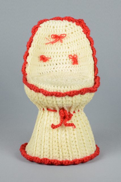 Chaise de poupée faite d’une structure en plastique recouverte d’un tricot de fibres synthétiques blanches avec des bordures rouges et des noeuds rouges dans le dossier. La base est circulaire et le dossier est enveloppant.