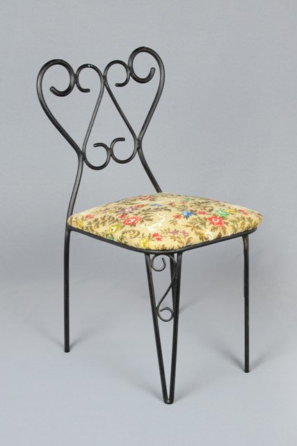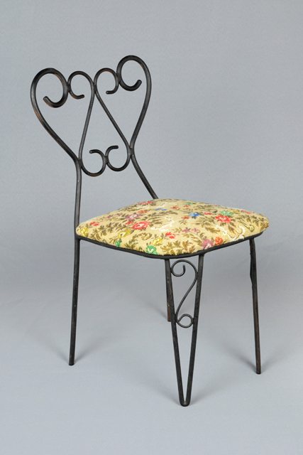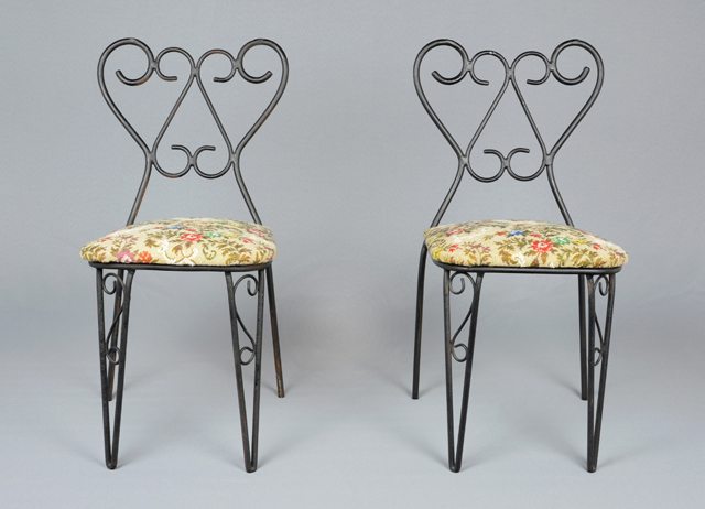 Ensemble de deux chaises en fer forgé peintes en noir avec un siège rembourré en tissu à motif floral, lequel est agrafé sur une plaque (de bois ?). Le siège est vissé à l’armature de fer. Sous une des chaises (1980-0232.1) se trouve une étiquette verte avec du texte noir.