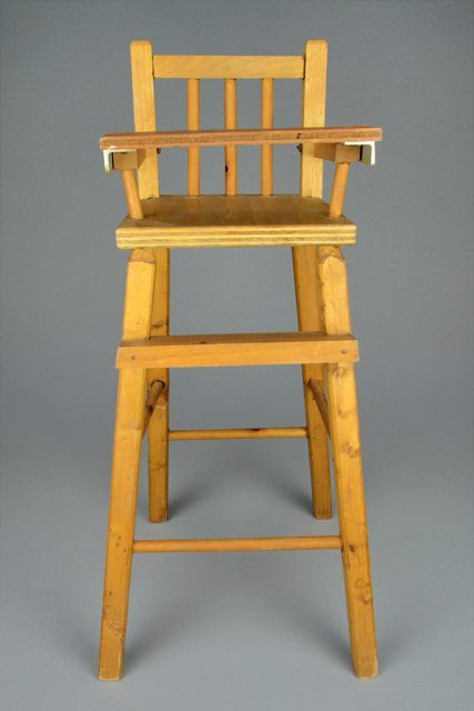 Petite chaise haute faite de divers types de bois. Le plateau est peint en brun et le dessous du siège est peint en blanc.