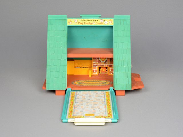 Ensemble de jeu de maison au toit vert en forme de triangle allongé. Les murs aux extrémités sont en plastique transparent avec au rez-de-chaussée des portes coulissantes. À chaque bout de la maison, il y a des balcons à l’étage. Un des côtés du toit s’ouvre à partir du haut pour devenir du terrassement et montrer l’intérieur de la maison. Les planchers sont en plastique orange et au rez-de-chaussée le mobilier est fait d’un bloc en plastique jaune avec les détails imprimés sur des appliqués. Il y a une poignée blanche sur le toit. Une clochette en métal gris est fixée au balcon du côté droit.
