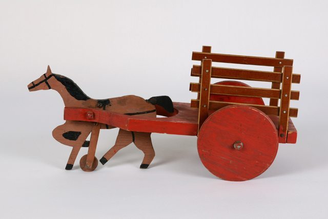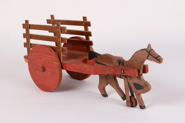 Charrette à deux roues avec cheval miniature en bois. La charrette est peinte en rouge et brun, les roues sont rouges et le cheval est peint brun avec les détails noirs. Le cheval a une roue sous les pattes avant pour permettre au jouet de rouler.