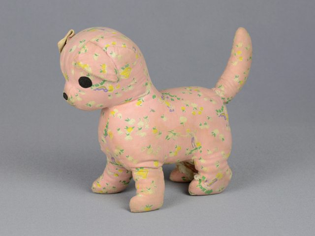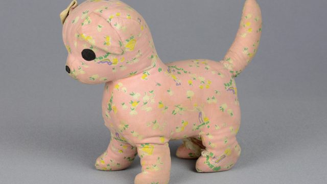 Chat jouet rembourré en tissu rose à motifs de fleurs jaunes et vertes. Les yeux et le nez sont formés par de petits appliqués noirs.