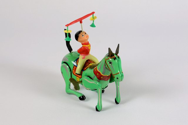 Cheval portant sur son dos un cavalier acrobate. L’acrobate donne l’impression de tenir en équilibre sur son front un balancier. Le cheval est vert à la crinière noire avec une selle en rouge et bleu décorée de motifs jaunes. La queue du cheval est en plastique noir et ses oreilles en caoutchouc noir. Le cavalier porte un pantalon jaune et un chandail rouge. Sur le flanc droit du cheval est insérée une clé pour amorcer l’automate.