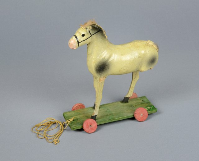 Petit cheval sur roulettes reposant sur une base verte en bois avec des roulettes rouges et une corde attachée à l’avant. Le cheval est blanc avec des taches noires sur les flancs et un attelage peint en noir à la tête. La crinière et la queue sont en fourrure et en cuir et sont collées au cheval. Une patte est manquante.