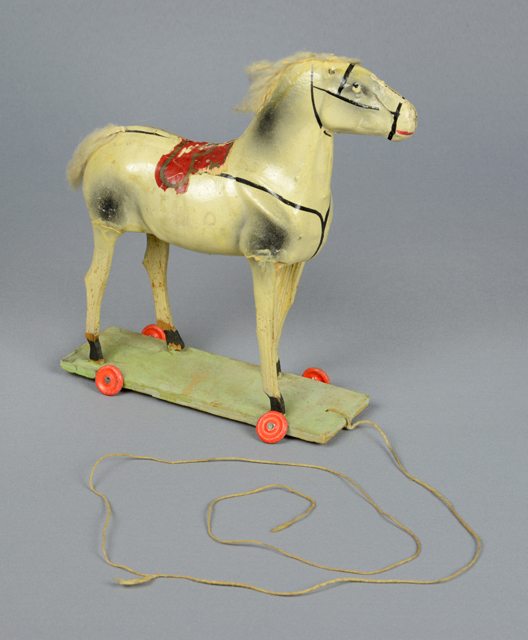 Petit cheval sur roulettes reposant sur une base verte en bois avec des roulettes rouges et une corde attachée à l’avant. Le cheval est blanc avec des taches noires sur les flancs et possède un attelage peint en noir à la tête et à l’avant. Une selle rouge et grise est collée sur le dos. La crinière et la queue sont faites de coton.