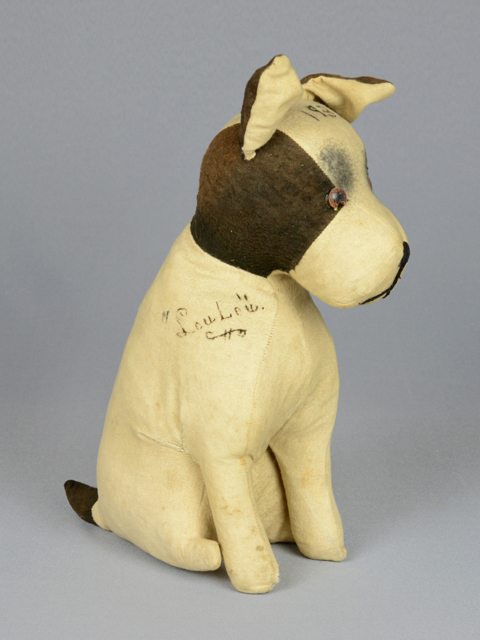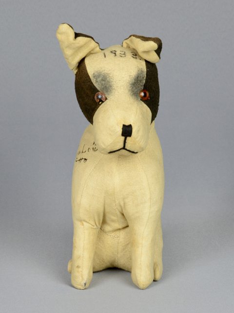Petit chien jouet en tissu rembourré de couleur écrue avec les côtés de la tête brun foncé. Les yeux sont en plastique orange et noir. Les traits du museau sont faits de fils noirs. Le chien est en position assise. Il a des inscriptions manuscrites à l’encre sur la tête et à l’épaule droite.