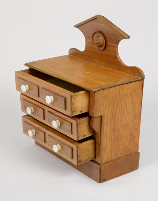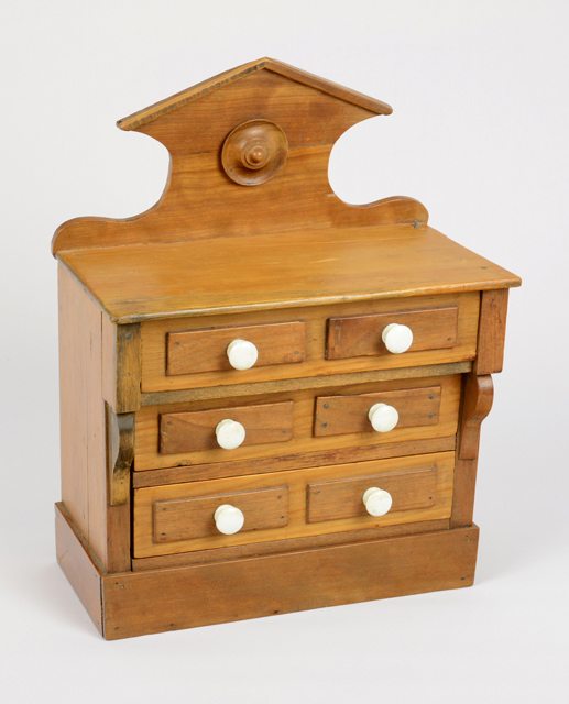 Commode de poupée miniature en bois verni avec des boutons de tiroirs en porcelaine blanche.