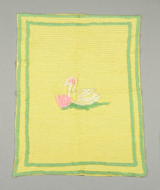 Couvre-lit de poupée en chenille jaune, orné de bordures vertes et d’un motif animal et floral vert, blanc et rose au centre.