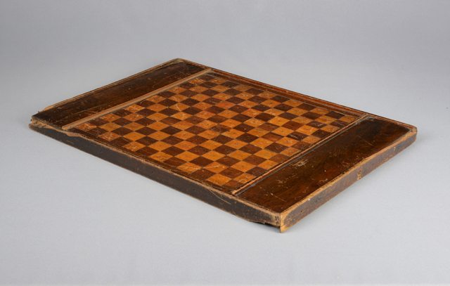 Damier en bois verni fait de 144 carrés en marqueterie de noyer et d’érable assujettis avec des chevilles de bois.