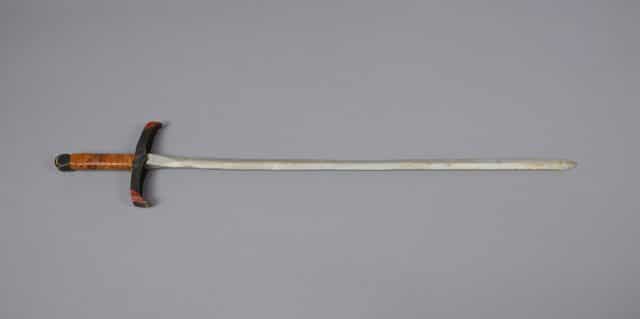 Épée en bois de fabrication artisanale. La lame est peinte en gris argenté, la garde est peinte en noir avec les bouts en rouge, la poignée est recouverte de cuir brun et le pommeau est peint en noir. Clous apparents au milieu de la garde.