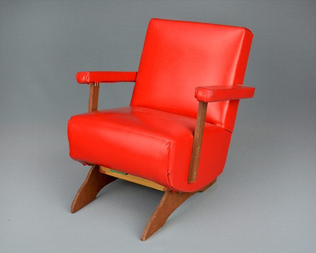 Petit fauteuil berçant fait de cuirette rouge et de bois peint en brun.