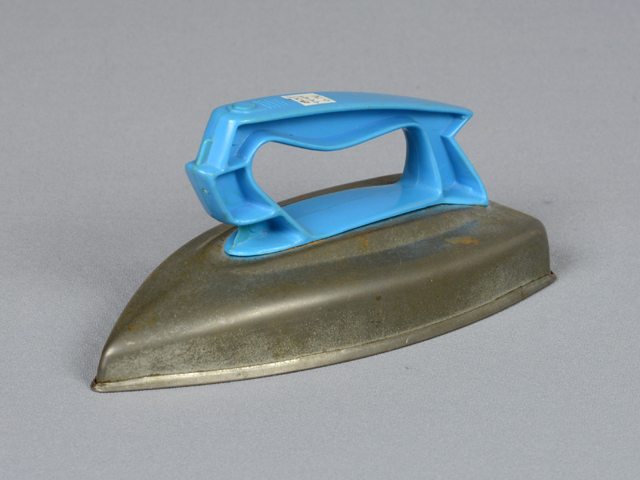 Petit fer à repasser en métal gris et à la poignée en plastique bleu.