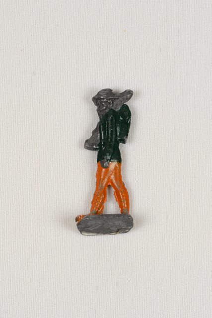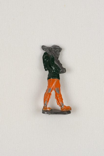Soldat de plomb, portant un pantalon orangé, une veste verte. Les chevilles du soldat sont tordues et empêchent le soldat de se tenir debout.