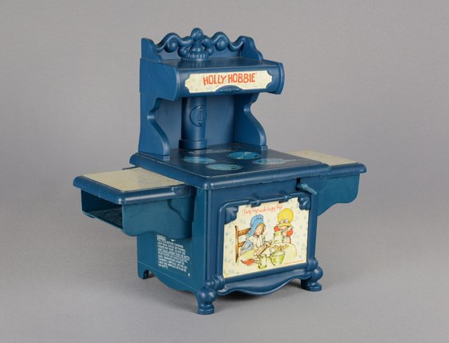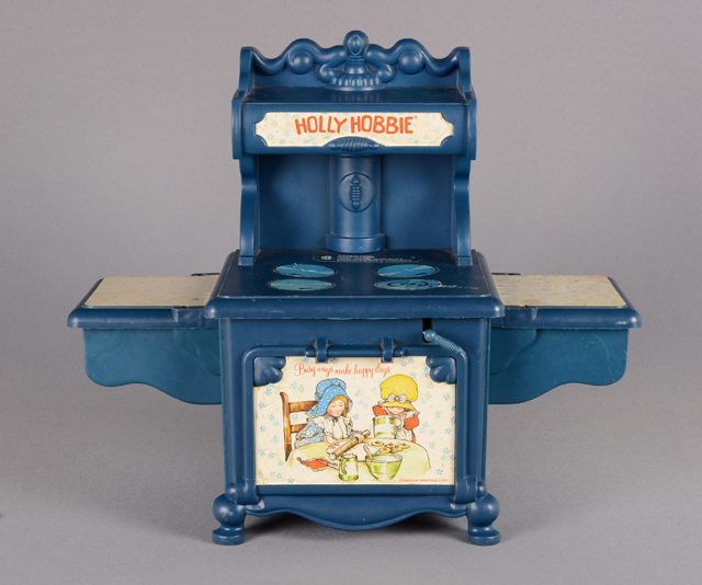 Petit four électrique avec une hotte en plastique bleu et des imprimés blancs collés à sa surface pour représenter certains détails comme les ronds de poêle et le nom du jouet. Sur les côtés du four se trouvent des ouvertures sous des plateaux pour faire entrer et sortir les plats à faire cuire.