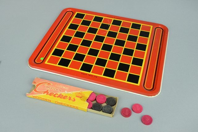 Jeu de dames constitué d’un damier de métal rouge, noir et jaune et d’une boîte de carton rouge, jaune et blanc contenant 12 dames roses et 12 dames noires, faites de bois.