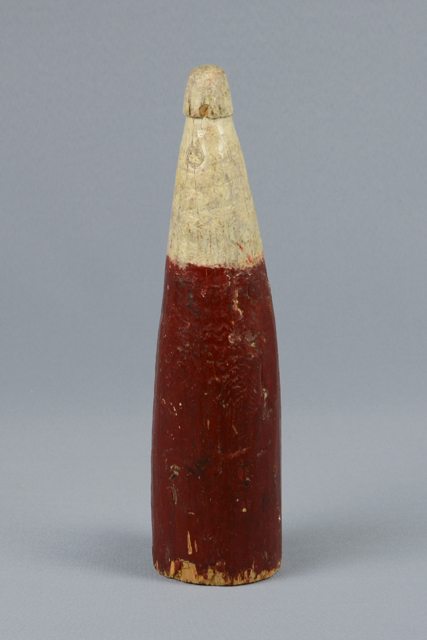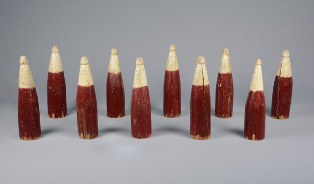 Jeu de 10 quilles en bois de pin. La base de chaque quille est de couleur bourgogne et le haut est de couleur blanche. Le sommet des quilles se termine par un renflement de forme ronde.