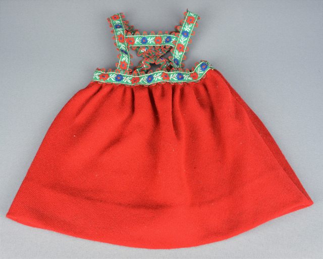 Petite jupe de tissu épais rouge vif, avec bretelles faites de ruban vert à motif floral rouge, bleu et blanc croisées à l’arrière.