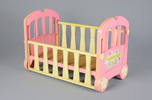 Lit de poupée en plastique rose et blanc crème avec un fond fait d’une planche de masonite. À la tête du lit et au pied du lit se trouve une étiquette collée de couleur rose, bleue, jaune et bleu foncé. Dans le lit, à la tête du lit et au pied, se trouve l’emblème du fabricant surmonté d’une couronne. Cet emblème est embossé dans le plastique du lit. Une plaque de carton avec le dessus imprimé en bleu de manière à représenter un matelas est installée sur le fond du lit.