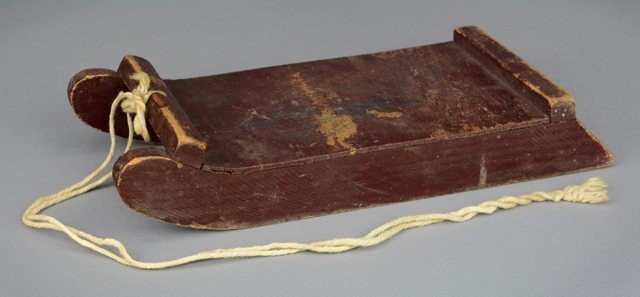 Petite luge de bois peinte en brun. Une corde blanche est nouée à l’avant.