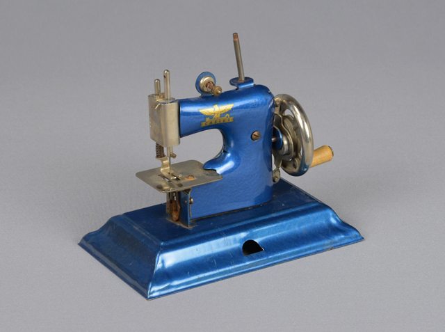 Machine à coudre jouet en métal bleu. Un appliqué doré prend place au haut de l’objet et représente un aigle tenant une clé dans ses serres. D’un côté se trouve une roue en métal et de l’autre un plateau et un pied de machine à coudre en métal. Sur le plateau, embossé dans le métal, se trouve également une illustration d’un aigle tenant une clé.