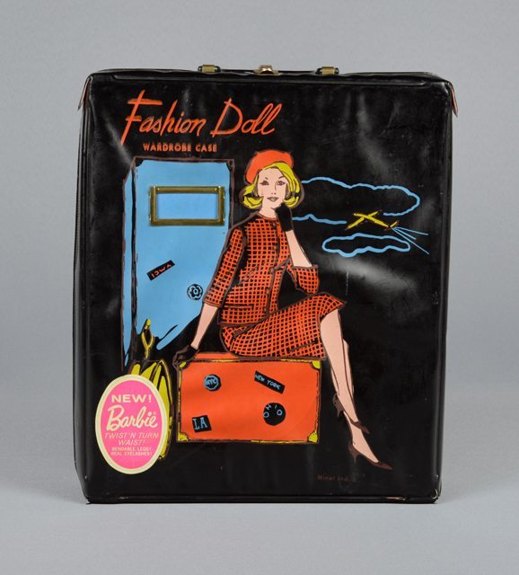 Mallette pour poupée en plastique noir avec sur le couvercle une illustration d’une femme au manteau carreauté rouge assise sur une malle rouge, en avant d’une grande malle bleue et un avion dans le ciel en arrière-plan. L’intérieur est fait de plastique rose avec un crochet pour suspendre les vêtements. La poignée est faite de plastique noir et est rivetée au sommet, par-dessus le loquet de métal.
