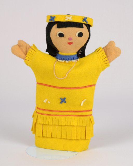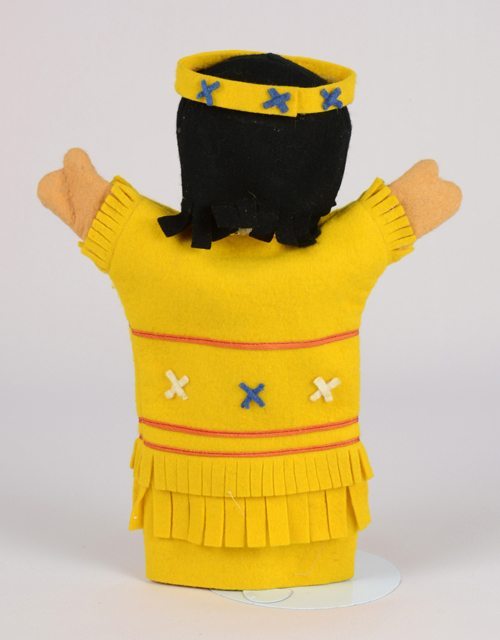 Marionnette fille avec un costume de style amérindien en feutre jaune avec des lignes rouges et des franges au bas. Les cheveux et les traits du visage sont faits à partir de collage de feutre de différentes couleurs. Elle porte un bandeau jaune aux motifs bleus et blancs.