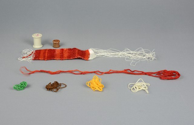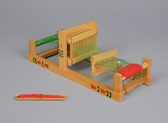 Métier à tisser miniature avec des fils de laine verte montés dessus. Sur les côtés, il y a des décorations peintes de fleurs vertes, rouges et roses. L’ensemble comprend aussi une navette en bois avec du fil rouge, une étoffe de laine rouge, 4 fils de laine de couleur blanche, jaune, brune et verte et deux bobines en plastique. L’ensemble est rangé dans une boîte en carton avec des illustrations de jouets dans des quadrillés imprimés en jaune, vert, bleu et rouge.