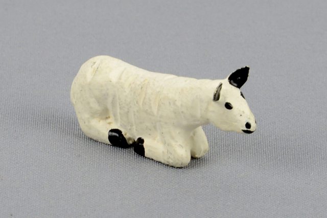 Petit mouton blanc en position couchée sculpté en pin avec les sabots et oreilles noirs.