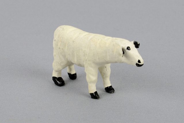 Petit mouton blanc sculpté en pin avec les sabots et oreilles noirs.