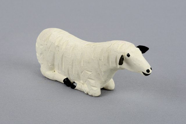 Petit mouton blanc en position couchée sculpté en pin avec les sabots et oreilles noirs.