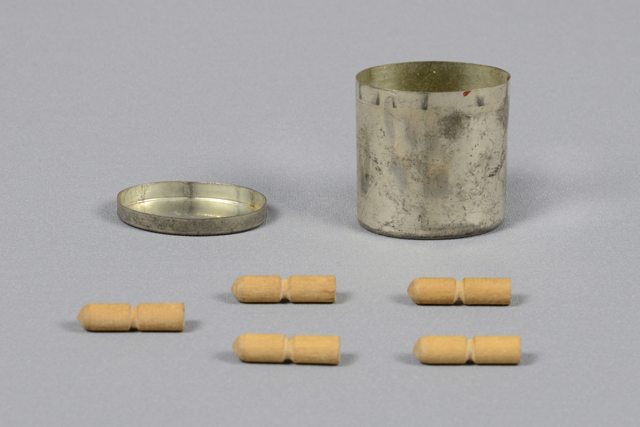 Boîte en métal de forme ovale avec cinq obus miniatures en bois.