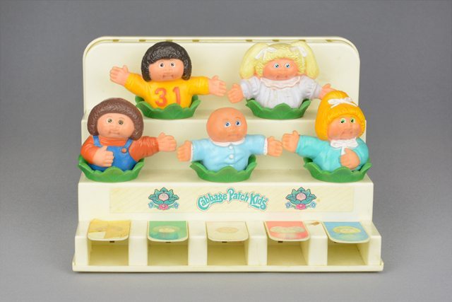 Petit orgue blanc ayant sur sa partie supérieure cinq figurines représentant des bébés aux vêtements bleus, blancs, jaunes et orange au milieu de couronnes de choux vertes. La partie inférieure présente un clavier de cinq touches.