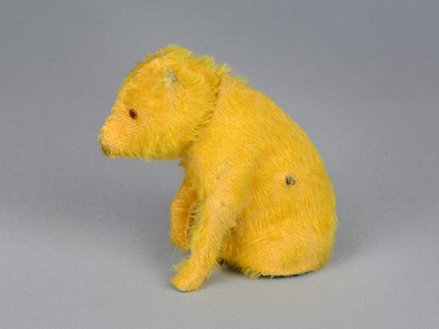 Petit ourson jouet jaune. Il y a une tige de métal qui sort sur le flanc gauche. Les yeux sont en plastique orange avec le centre noir.