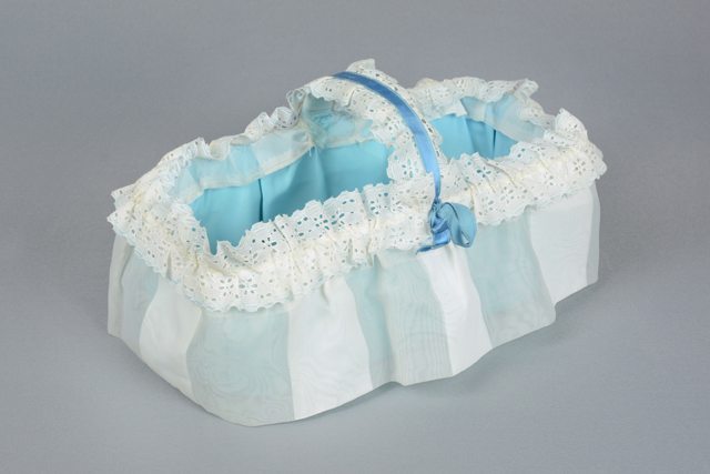 Panier en carton recouvert de tissu bleu et décoré de tissu blanc et de dentelle à l’extérieur et sur la poignée. La poignée est également ornée d’un ruban bleu avec une boucle de chaque côté du panier. La structure de la poignée semble faite de bois.