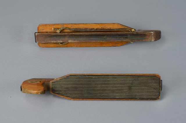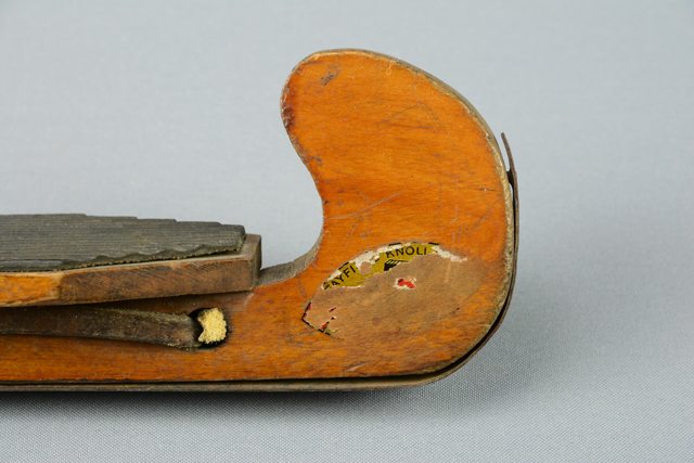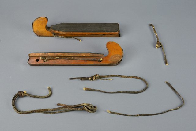 Paire de patins en bois sur des lames larges et ferrées. Le repose-pieds présente une surface caoutchoutée. Des courroies en cuir sont attachées à la base des patins permettant de fixer la botte du patineur aux repose-pieds. Sur le côté droit des patins, à l’avant, il y a une trace ovale. Sur l’un des patins, un reste d’étiquette se trouve dans cette trace.