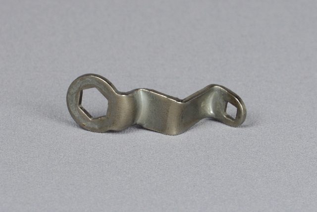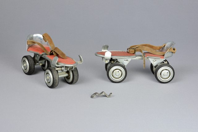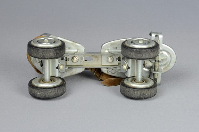 Paire de patins à roulettes avec des bandes de cuir de couleur brune et boucle de métal comme attache à la cheville. Les roulettes sont en métal gris et en caoutchouc noir. Sur les repose-pieds des patins se trouve une surface antidérapante en caoutchouc rouge. Une clé d’ajustement en métal gris est comprise dans l’ensemble.
