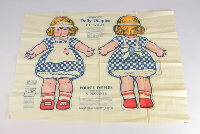Patron de tissu où il est imprimé la forme de devant et d’arrière d’une figure humaine. Ce patron est plié et rangé dans une enveloppe brune avec des imprimés bleus et une image de poupée sur le recto de l’enveloppe.